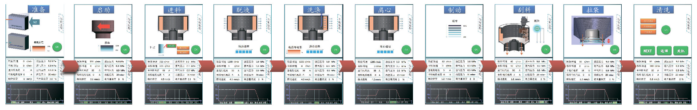 The operation of centrifuge is controlled by PLC. The system runs automatically according to the preset program. Different centrifuges have corresponding operating parameters or range of adjustment.