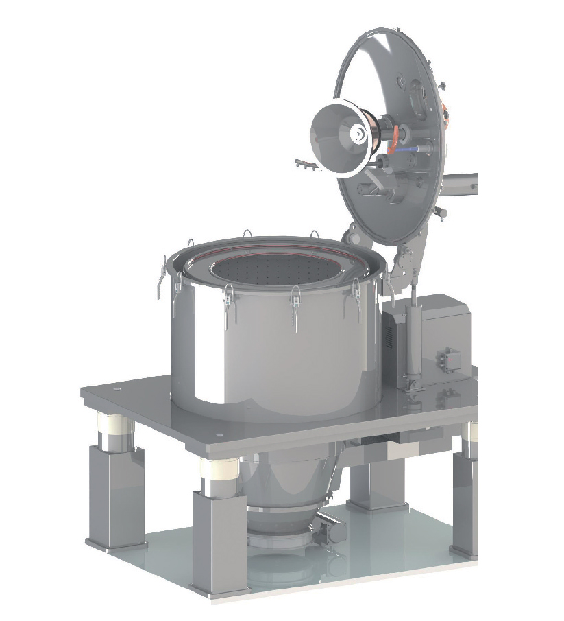 液/固混合流體通過進料管經(jīng)布料盤加速均勻分布于離心機轉鼓內,在離心力場作用下,通過濾片截留固相,濾出液相。持續(xù)進料,直至料滿,停止進料,如工藝需要時則對濾餅進行洗滌、提純,同時將洗滌液濾出。進一步脫液,直至達到分離要求。降至低速,刮刀將大部分濾餅刮下,抻袋裝置將殘余濾餅卸出,完成一次工作循環(huán)。